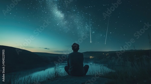 A family watches in awe as bright meteors streak across the night sky from a hilltop