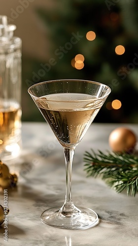 A festive cocktail in a stylish glass sits on a marble surface, surrounded by holiday decorations and soft bokeh lights.