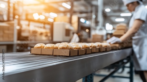 A food processing plant with a conveyor belt moving freshly packaged products under bright, sanitary conditions