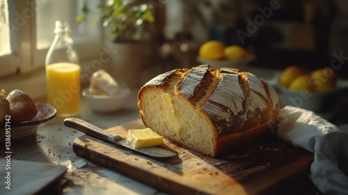 A freshly baked loaf of sourdough bread on a wooden board with butter and a knife. Featuring comfort and homemade goodness