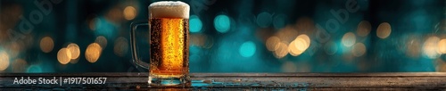 A frothy beer mug sits on a wooden surface, illuminated by soft, colorful bokeh lights in the background, creating a cozy atmosphere.