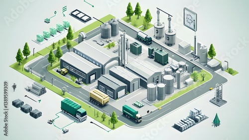 A futuristic circular supply chain system AI-managed logistics tracking the life cycle of products from production to recycling, with visual loops and real-time data dashboards isometric style, sustai