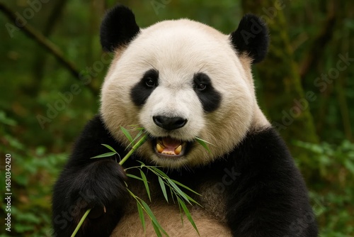 A gentle panda enjoys a bamboo snack amidst the tranquil embrace of lush greenery