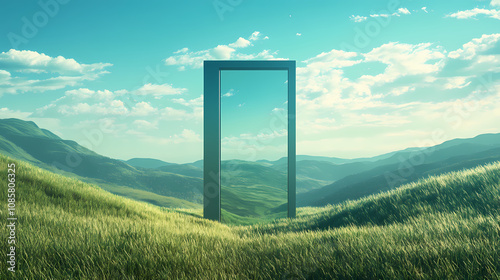 A glass door in the middle of grassland on hills. Halcyon. Illustration