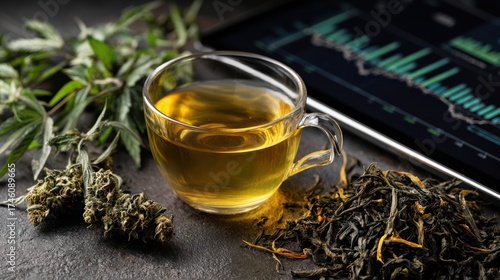 A glass of herbal tea sits with cannabis buds, leaves, and stock chart on a tablet