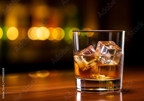 A glass of whiskey with ice cubes on a wooden surface, with blurred colorful lights in the background, evoking a sophisticated bar atmosphere