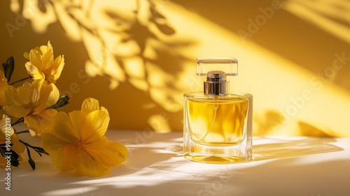 A glass perfume bottle with golden-yellow liquid, set against a bright yellow background with soft floral shadows, evoking elegance, warmth, and luxury.
