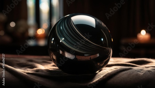A glossy black obsidian sphere with a smooth, mirror-like surface, perfectly polished and resting, reflecting its surroundings with a deep, mysterious elegance.