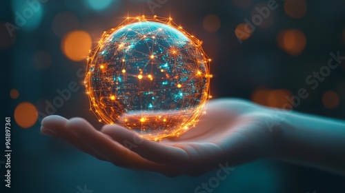 A glowing orb held in a hand, symbolizing technology and connection in a digital world, illuminated with vibrant lights.