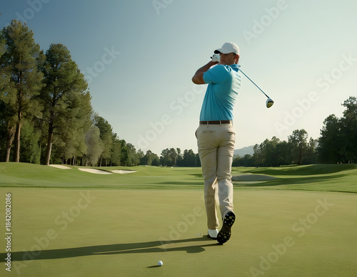 A golfer is playing on a beautiful golf course. A young man is playing golf on the green.