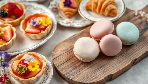 A gourmet display of French pastries, macarons, and fruit tarts creatively adorned with fresh flowers, elegantly presented on rustic wooden placemats, perfect for celebratory events or sophisticated c