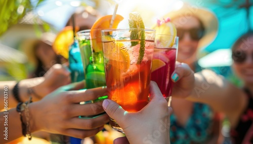 A group of friends toasting with colorful cocktails at an outdoor bar, with a close-up on the drinks and their hands holding them Generative AI