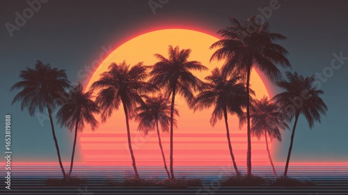 A group of palm trees stands in silhouette against a colorful sunset, with striking hues of orange, pink, and purple blending together. The scene captures the serene beauty of twilight near the ocean.