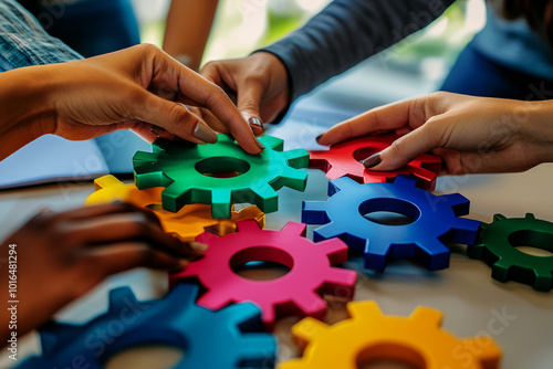 A group of people holding colorful gears in their hands, a collaboration and success concept.