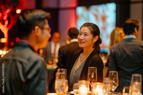 A group of professionals mingles at a corporate event, engaging in lively discussions and networking. The setting features a well-decorated venue with elegant table settings, ambient lighting