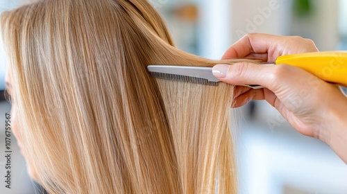 A hairdresser meticulously styles blonde hair using a precision comb, ensuring every strand is perfectly aligned for a sleek and polished look.