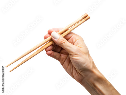 A hand holding wooden chopsticks isolated on white background, a traditional utensil for eating Asian cuisine like sushi