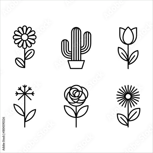 A hand-drawn vector set of floral icons featuring a rose, leaf, and blossom illustration for spring and summer design patterns