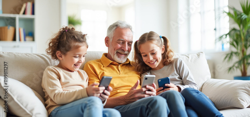 A happy grandfather and his grandchildren are sitting on the couch watching photos on the phone chatting