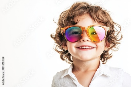 A happy toddler with curly hair smiles while wearing colorful sunglasses.