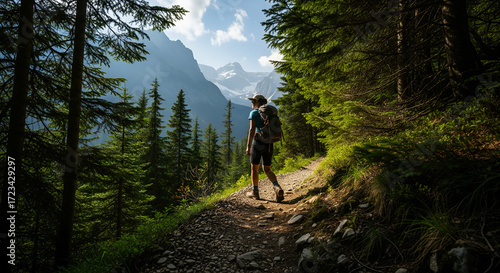A hiker pauses on a winding forest path, taking in the majestic view of snow-capped mountains under a bright blue sky.