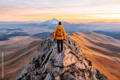 A hiker standing at the peak of a mountain, staring at the horizon, symbolizing the critical moment of achieving a goal