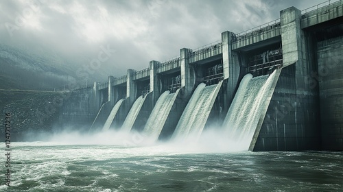 A hydroelectric dam generating power for industrial use, with water flowing powerfully through turbines.