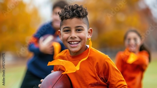 A joyful child in an orange shirt holds a football, running amidst autumn leaves with friends in the background.