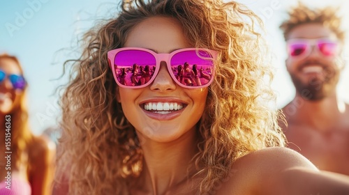 A joyful group of friends poses for a bright and colorful selfie at the beach, showcasing their laughter and happiness against a sunny backdrop and picturesque ocean waves.