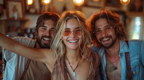 A joyous group of friends, dressed in their finest clothing, stand together in front of a beautiful wall, beaming with laughter and happiness as they capture the memory of a wedding day