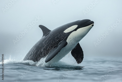 a killer whale jumping out of the water. Its powerful body is partially in the air, and droplets of water splash around.