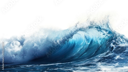 A large, powerful wave crashes against a white background, creating a dramatic and powerful image.