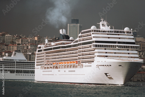 a large sea passenger liner departs from the shore for a trip.