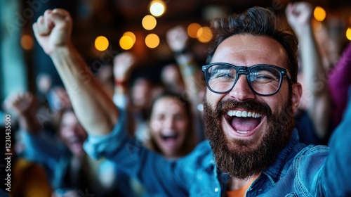A lively crowd of happy faces enthusiastically celebrating an event, showcasing joy and excitement with hands raised and smiles, capturing a vibrant atmosphere of togetherness.