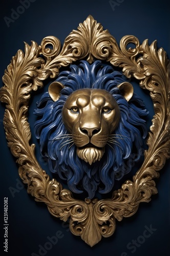 A majestic 3D metallic coat of arms featuring a golden lion against a rich blue background. This regal emblem symbolizes strength, nobility, and heritage with intricate detailing.