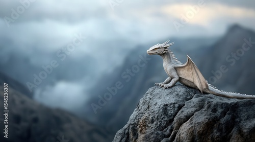 A majestic dragon rests on a rocky summit, its shimmering scales glistening in hues of silver and blue. The ominous storm brews, enhancing the awe-inspiring atmosphere