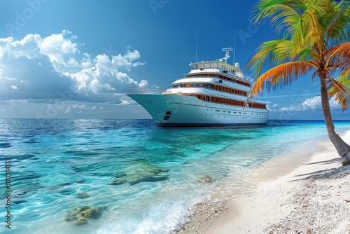 A majestic yacht anchored near a tropical island with vibrant turquoise waters, white sandy shores, and a lone palm tree, set against a bright blue sky and calm ocean.