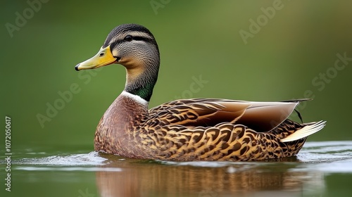 A mallard duck swims gracefully through a pond, its feathers glistening in the sunlight.