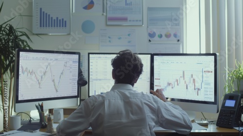 A man analyzes financial graphs on three monitors in a bright office, illustrating precision and diligence in financial work and market analysis.