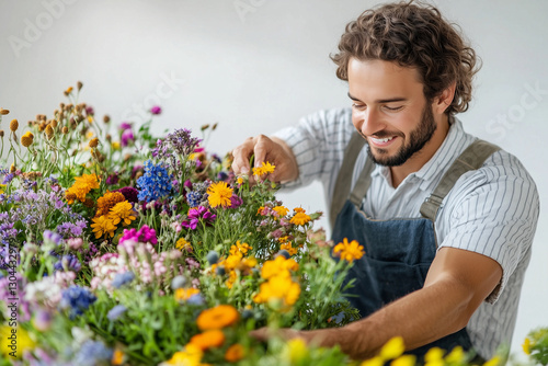 a man is arranging flowers in a garden center with a smile on his face and a beard on his head