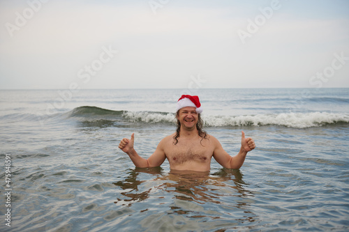 a man wearing a santa claus hat at the sea