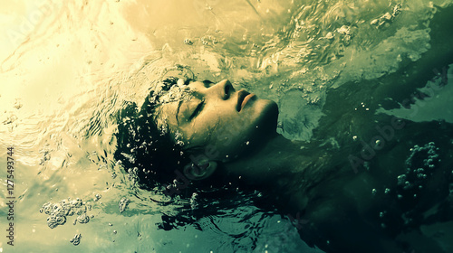 A manipulated image of a person floating in water, with a serene expression, water effects enhanced