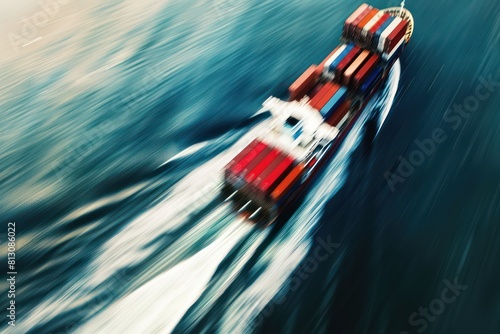 A massive cargo ship sailing across the open sea, stacked high with containers destined for ports worldwide, symbolizing global trade and logistics