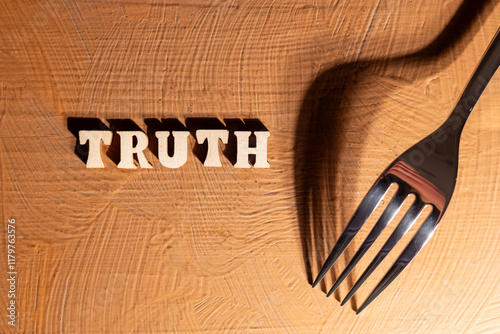 a metal fork casting a curved shadow on the surface. on the surface, the word is true