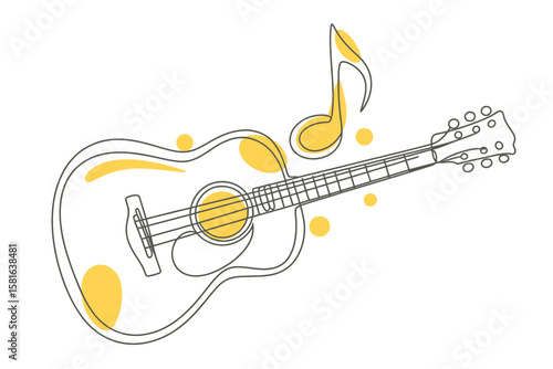 A minimalist line art drawing of an acoustic guitar with a musical note and yellow accents floating around it