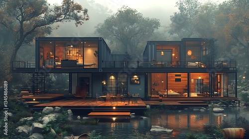 A modern container house in a Nordic setting, featuring an open-concept wooden deck, simple Scandinavian furnishings, and a panoramic glass-walled second floor.