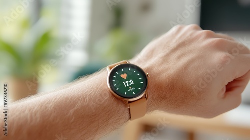 A modern smartwatch on a wrist displays the time 12:20 with a heart icon, symbolizing the fusion of technology and health in contemporary lifestyle.