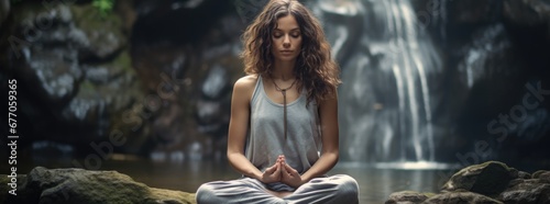 A Moment of Serenity: Woman Meditating in Lotus Position Before Cascading Waterfall