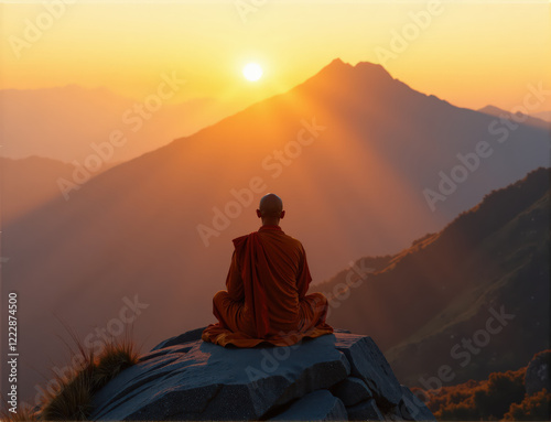A monk meditates on a mountaintop, welcoming the calm of dawn and the warmth of the rising sun.