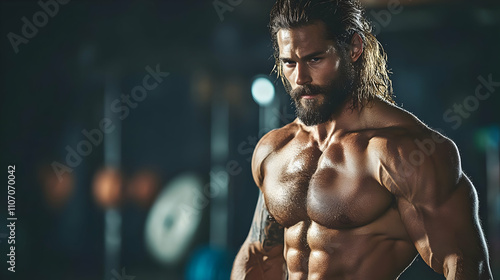 A muscular man posing in a gym, showcasing fitness and strength.
